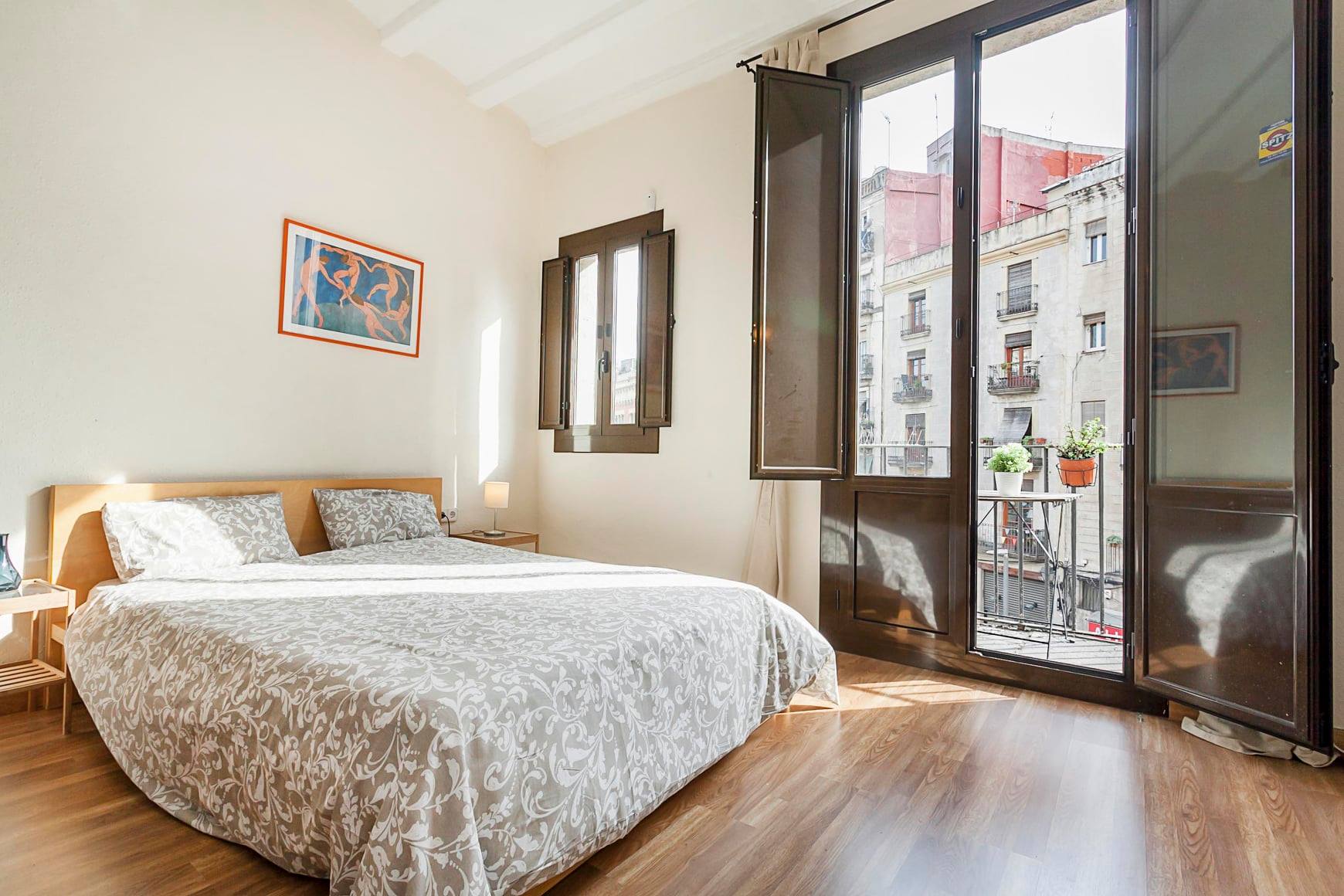 PLAZA DE PEDRÓ 8-10 2nd: Loft-style apartment, very well located, in Plaza de Pedró 8-10, 2nd 2nd in the neighborhood del Raval, a few meters from the Rambla de Raval, in the heart of the city. It is a second floor of a very old, well maintained, fully renovated, without elevator. It is a large space with a balcony with open views to the square, light and sun. It is fully equipped, with a kitchenette; a double bed; has a spacious bathroom and separate laundry room with washing machine. It is a contemporary-style space, with beautiful wooden floors, double-glazed windows. Is totally equipped. The price is 800 Euros / month. The extras are 80 Euros for the final cleaning + 20 Euros fortnightly for 2 hours of cleaning + consumption of electricity, water and Internet / telephone per bill. 2 month deposit.